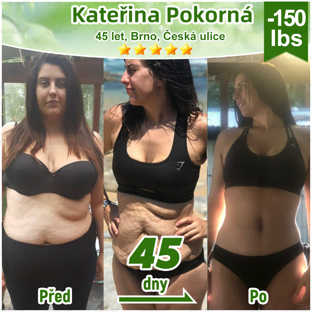 Výsledky předčily všechna má očekávání: zhubla jsem z 145 kg na 77 kg — to je celkem 68 kg dole. Moje játra se vrátila do normálu, mé tělo se cítilo lehčí než za poslední roky a mé manželství se stalo bližším než kdy dřív. BuildLeaf® mi nepomohl jen zhubnout — vrátil mi zdraví, sebevědomí a život.“ — Kateřina Pokorná,45let,Brno,Česká ulice